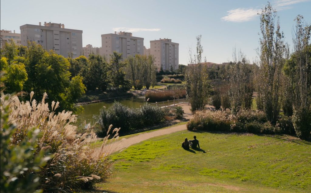 Inaugurado en 2015, y promovido por el Ayuntamiento de Alicante y Aguas de Alicante, este parque urbano no solo retiene hasta 45.000 m³ de agua de lluvia para evitar inundaciones. También bombea el agua recogida hacia la depuradora para reutilizarla como riego, regenerando el ciclo y haciendo ciudad con lógica circular.